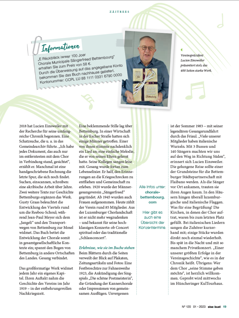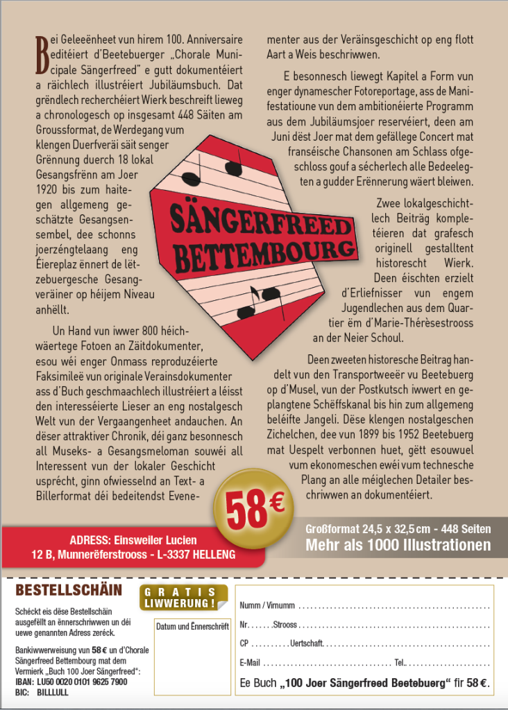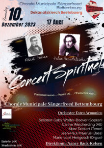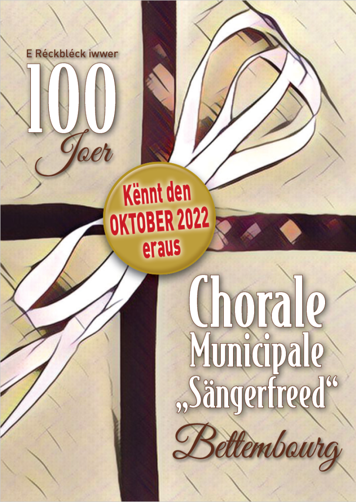 W. A. Mozart – Requiem KV. 626Sonndes de 7. Dezember 2025 um 17.00 Auer an der Kierch zu BeetebuergLoscht fir dëse grousse Projet matzemaachen?Eis Prouwe sinn ëmmer Mëttwochs Owes um 19.30 Aueram Centre Culturel (KulTourhaus) zu Hunchereng Weider Informatiounen per Email oder per Telefon bei eiser Dirigentin,eisem Präsident oder eiser Sekretärin.Nancy Back-Kelsen Dirigentin Tel.: +352 …