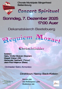 Concert spirituel Requiem Wolfgang Amadeus Mozart Solisten: Gaby Wolter-Boever (Sopran) Magali Weber (Alt) Alexander Gebhard(Tenor) Jean-Paul Majerus (Bass) Orchester Estro Armonico Chorale Municipale Sängerfreed Bettembourg Direktioun: Nancy Back-Kelsen